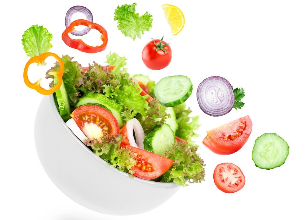 mevsim yeşillikleri, çeri domates, salatalık, terbiyeli tavuk parçaları