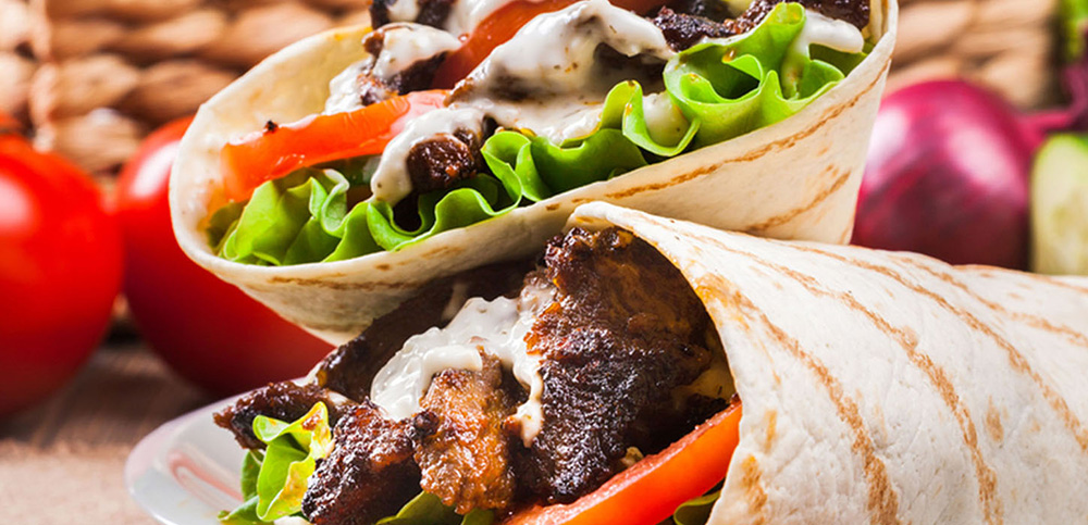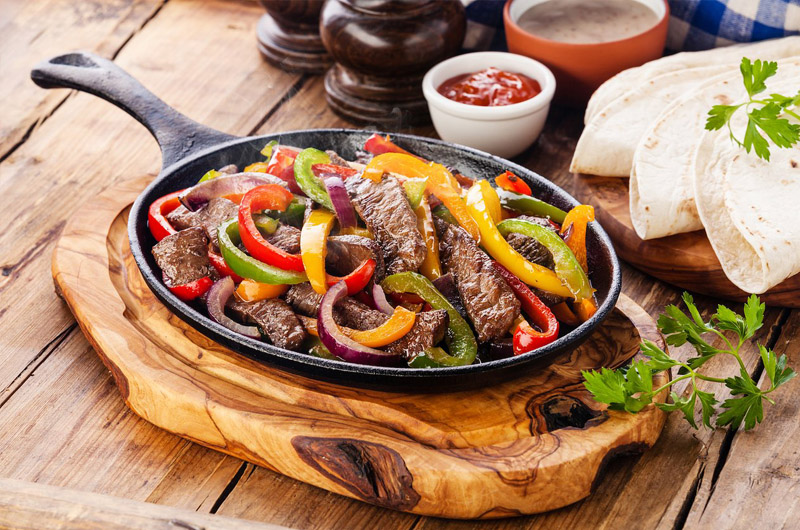 tavuk bonfile parçaları, renkli taze biber, kuru soğan, dağ kekiği, salsa sos,guacamole sos, jalapeno biberi ile