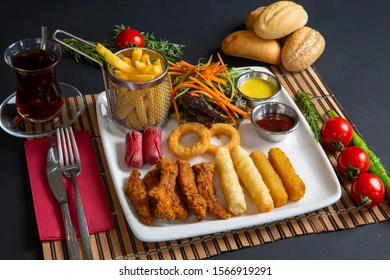 parmak patates, soğan halkası, sosis, mozarella sticks, sucuk şiş, ızgara çeri domates ,kajun baharatı ve kokteyl sos ile